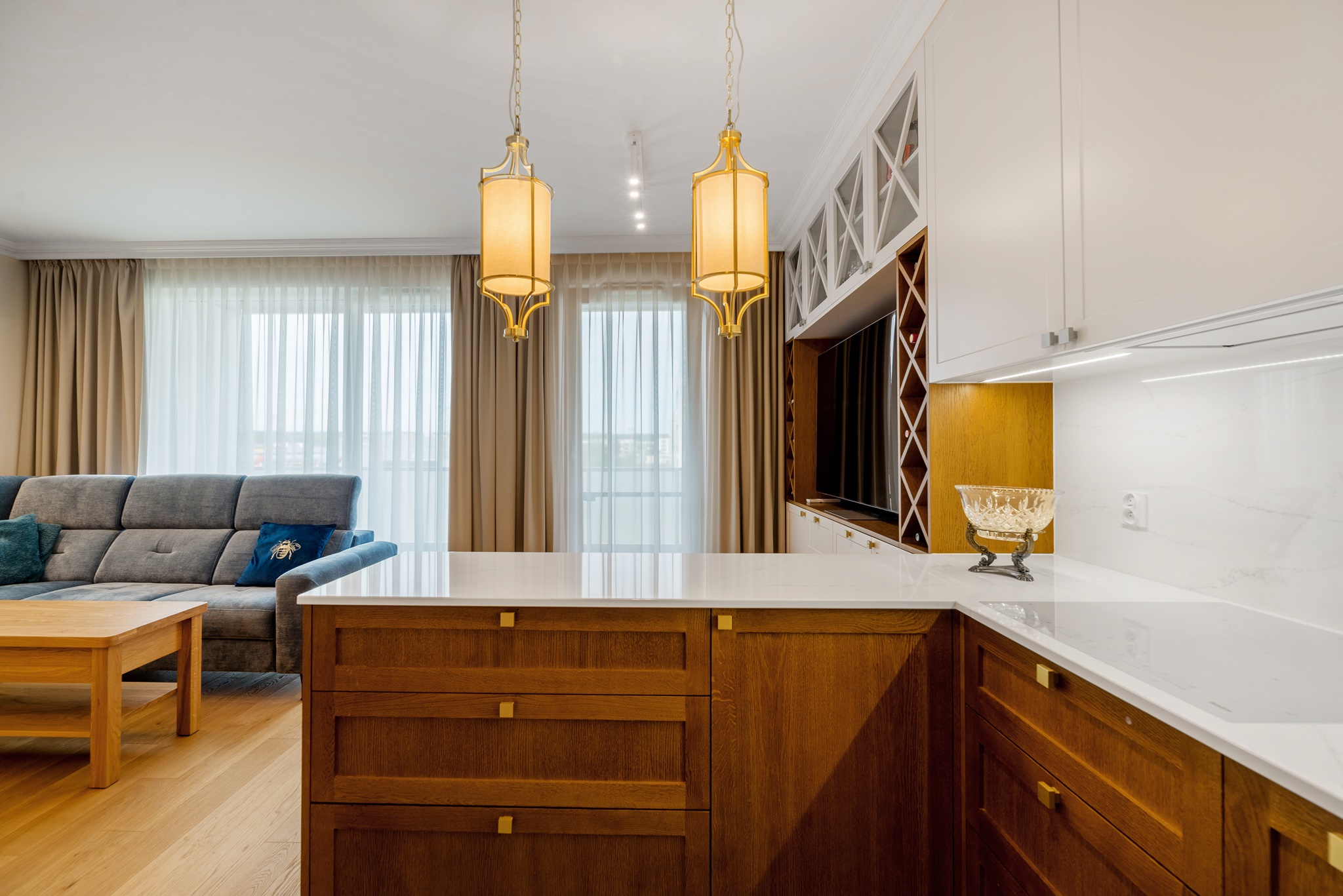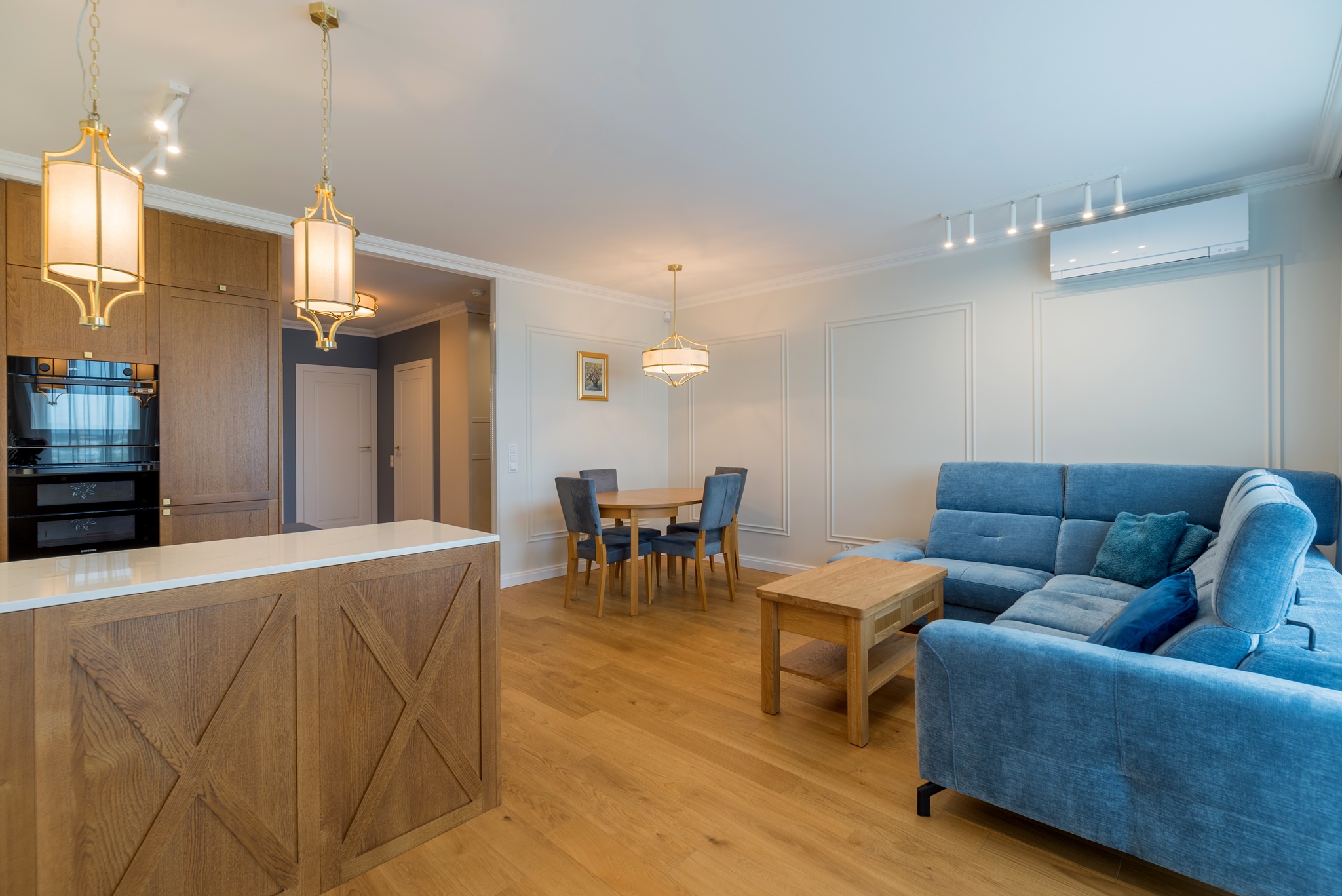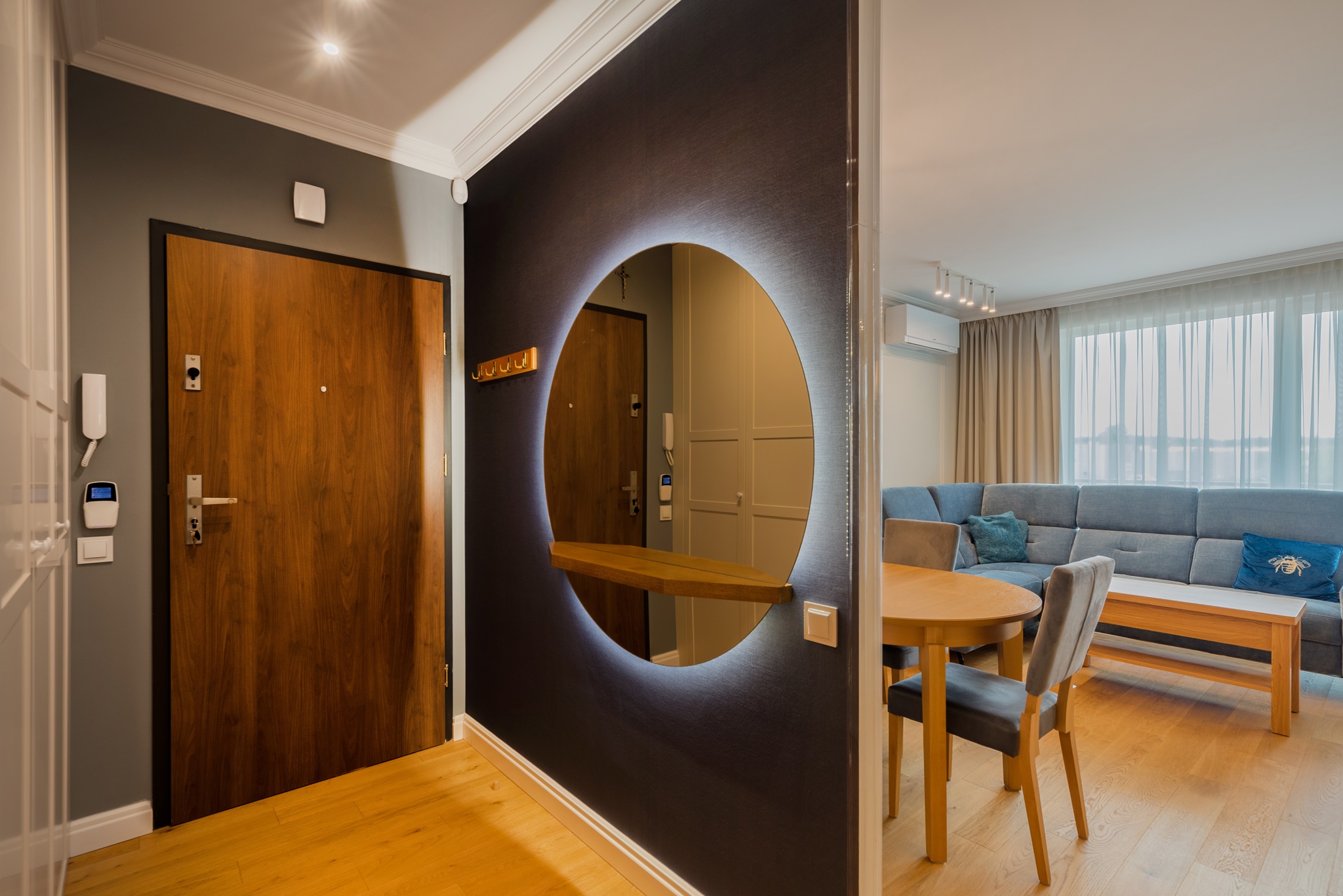 Kompleksowa realizacja od projektu pod klucz trzypokojowego apartamentu znajdującego się w centrum Pruszcza Gdańskiego. Zakres prac obejmował od projektu wykonawczego przez prace remontowo-budowlane, instalacyjne, wykończeniowe, instalację klimatyzacji, zabudowy stolarskie aż po montaż zasłon i dodatków.